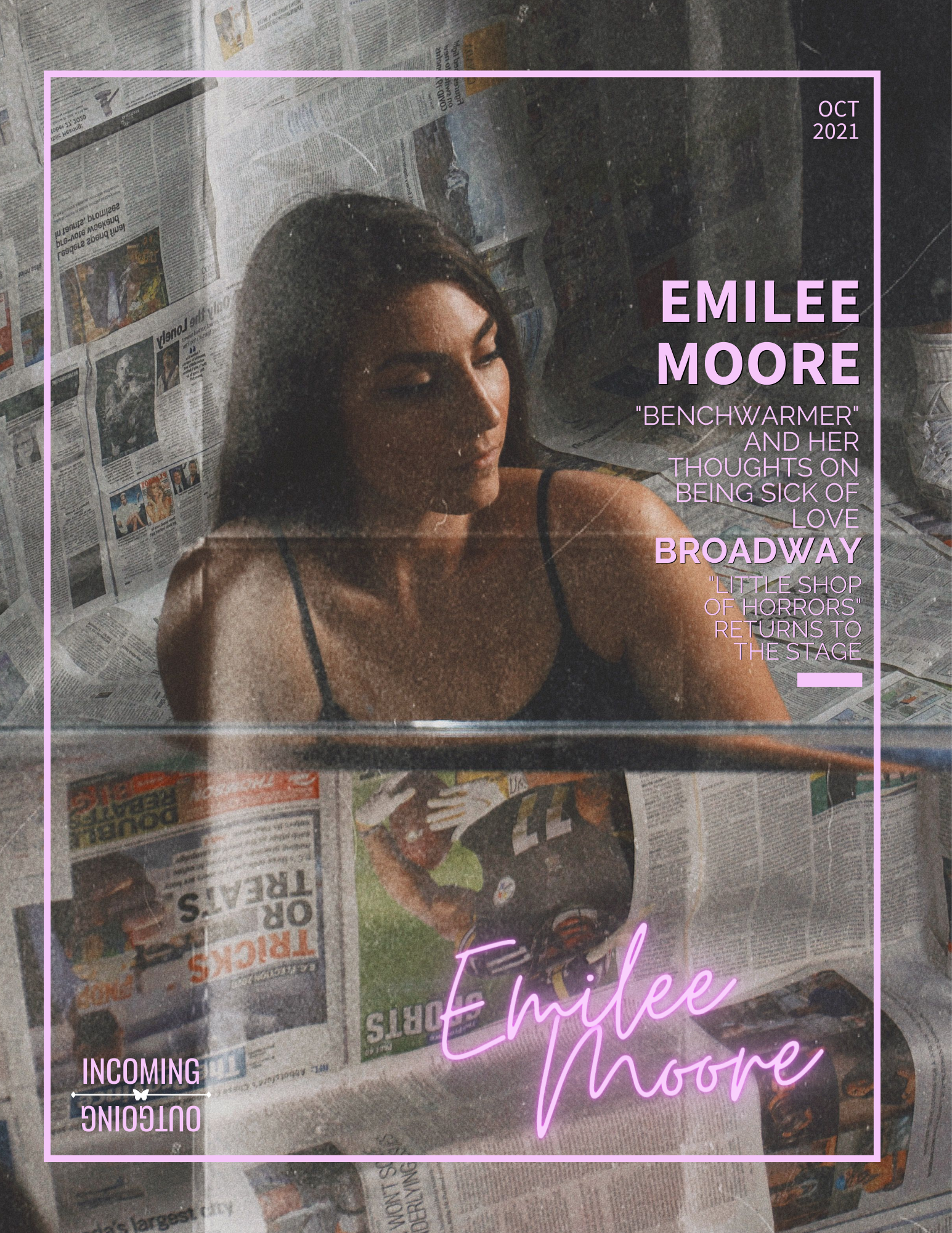 The eighth issue of Incoming & Outgoing! Incoming & Outgoing is a magazine based entirely around music, highlighting smaller up-and-coming artists. This month's issue features EMILEE MOORE as our cover star, and discusses the return of Little Shop of Horrors, a playlist of the spookiest songs of the season, and a review of Leave Me Feeling Confident by THE DRIVER ERA!